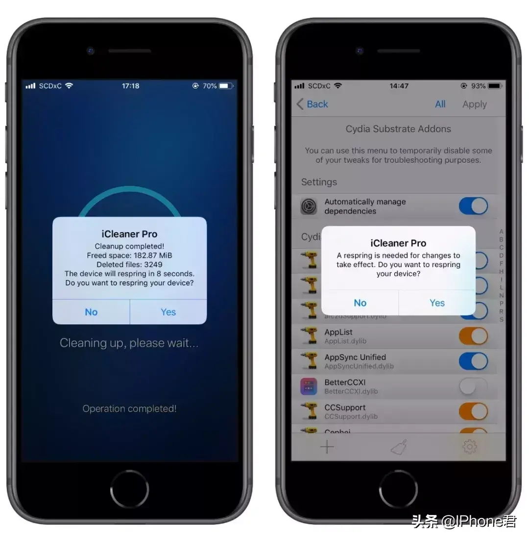 清理手机缓存垃圾,小内存设备的福音,还可以用来排查不兼容或相互冲突的插件。使用方法:打开 iCleaner Pro 之后点击左下角的「+」,选择「Cydia Substrate Addons」,关掉需要检测的插件开关,再点击右上角的「Apply」,最后点击「Yes」注销,该插件就会失效,这样就可以成功排查不兼容或相互冲突的插件(插件是否兼容和开关颜色无关)。虽然目前弹窗提示可能不支持 iOS 12,但实际测试主要功能都已经支持到了 iOS 12.1.2。