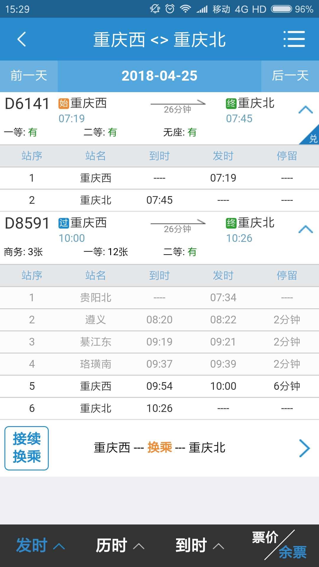 每天有两趟列车同时经过重庆西站和重庆北站,二十多公里的路程只要26分钟,二等座票价15元,一等座票价25元,是不是很方便呢。D6141次列车是为西站和北站特意开通的一列专车,全程只有这一个站。除了方便换乘的乘客,对于早高峰时的上班族也是很方便。D8591次列车是直接从贵阳始发站发过来的列车,全程票价129元,历时3小时左右,贵州的乘客就能到达重庆北站。