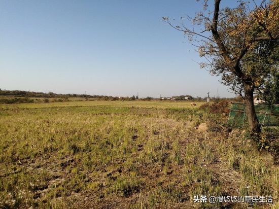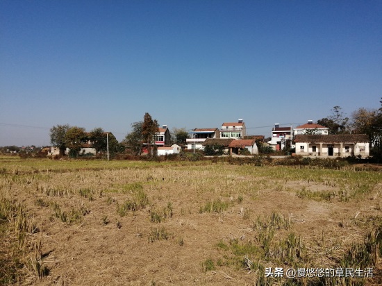 收完稻谷的田野,还未翻耕,与远处宁静的村庄,构成一幅初冬的画。