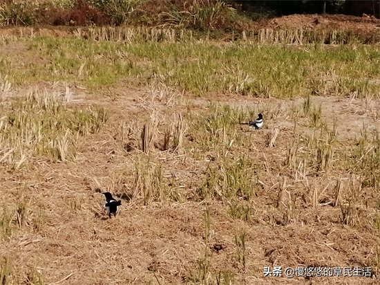 田野里觅食的两只喜鹊,欢快地蹦来蹦去。