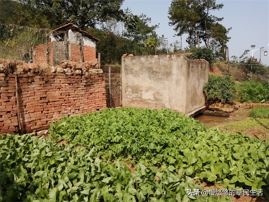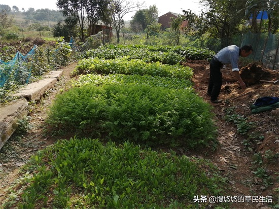 在自家菜园劳作的老人,蔬菜长得绿油油的,非常可人。