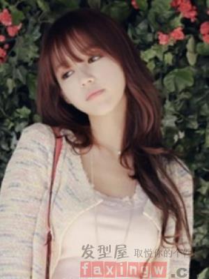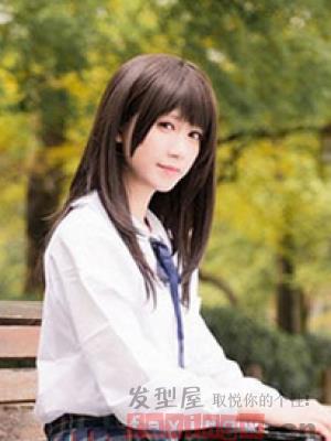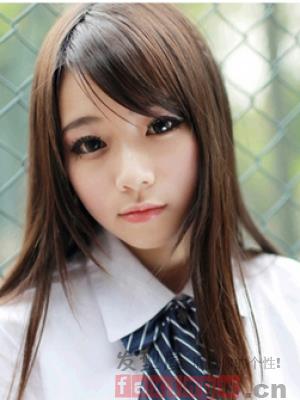 很适合小脸女学生的一款斜刘海的披肩直发发型,深棕色系的发色,白皙的脸蛋,突显十足青春灵动气质。