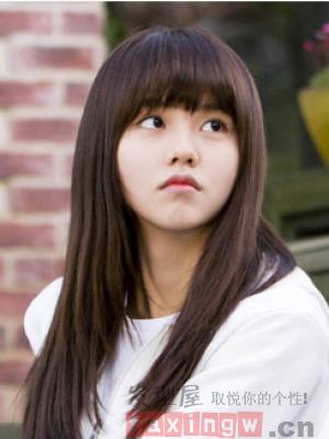很适合大学生妹纸的一款披肩中长发直发发型,搭配上柔顺的齐刘海发型,白皙的脸蛋,修颜减龄更清新。