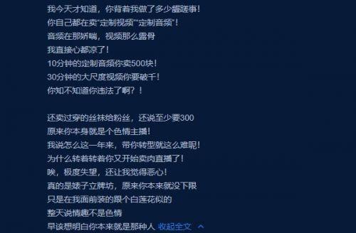 除此之外,陈贤还再次爆料了一些猛料,他拿到了轩子所谓“黄播”的“证据”,根据陈贤的描述,这种属于私人的定制音频或者视频尺度非常的大,他直言轩子已经是一个真正的“色情主播”。