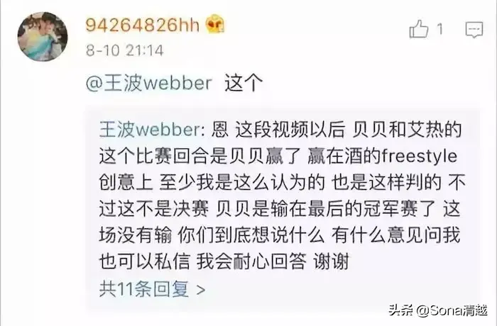 后来battle完了以后,艾热的亲友团太多,本想宣布艾热赢,后来加时赛,围绕酒来说话题。艾热明显跑题了,贝贝在这个话题里展现了自己高超的freestyle技巧,完胜艾热。