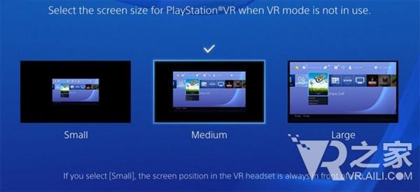 在PSVR的电影模式下,玩家可以选择三种不同的尺寸,玩家可以根据游戏本身的画质以及个人的爱好进行调节。另外,PSVR玩游戏时并不需要液晶显示器,只需要拥有PS4和PSVR头显设备就能尽情玩耍,各种体验店上的电脑屏幕多为展示用,对于玩家来说它们并不是必须的东西。