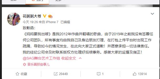此次抄袭风波花粥致歉称是由于当年翻唱这首歌曲,朋友打包上传平台时出现的工作疏漏导致。