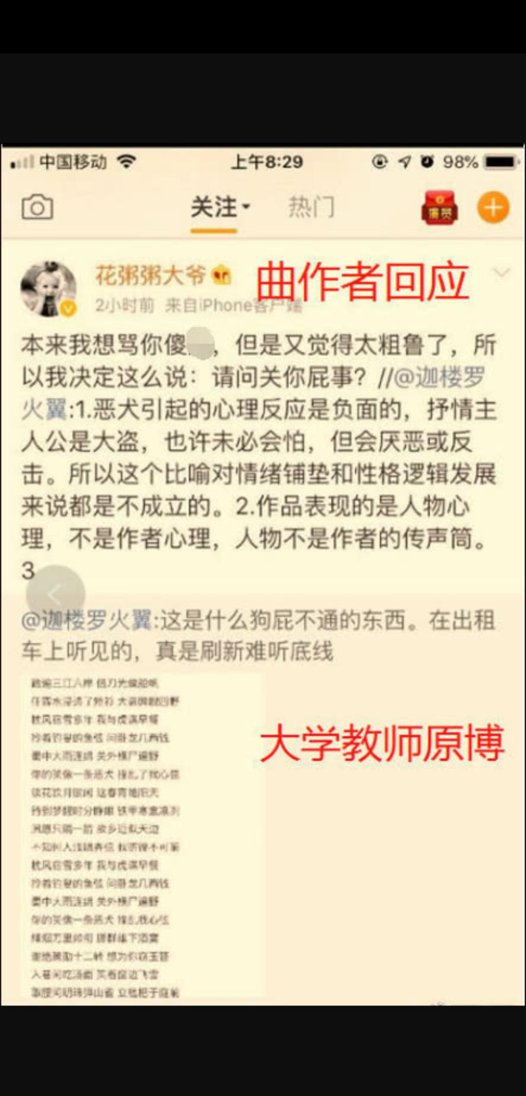其实花粥的歌曲《盗将行》早前也受到过较大争议,有大学教授怒批歌词狗屁不通,花粥也做出了强硬的反击。