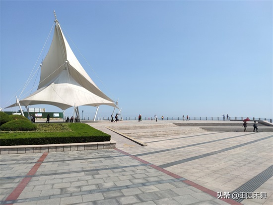 从礁石广场继续向北,能看到一座大型的海岸广场,上面有白色张拉膜遮阳棚,这便是望海广场,又称观涛广场。