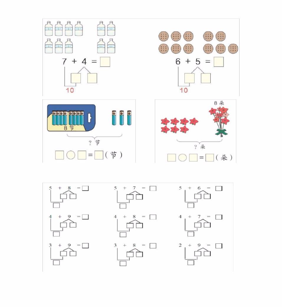 例如9+5 ,将5 分成1 和4,因为9 凑十缺 1,所以要分出 1。 所以9+5 ,就分解计算 9+1=10 、然后 10+4=14 。