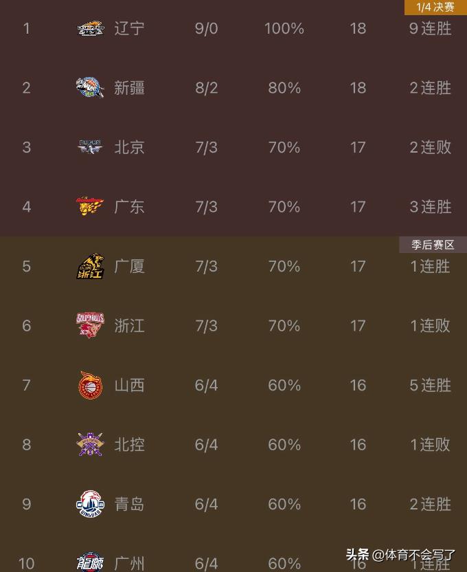 CBA最新排名出炉:辽宁9连胜登顶,新疆第二,北京广东占据前四