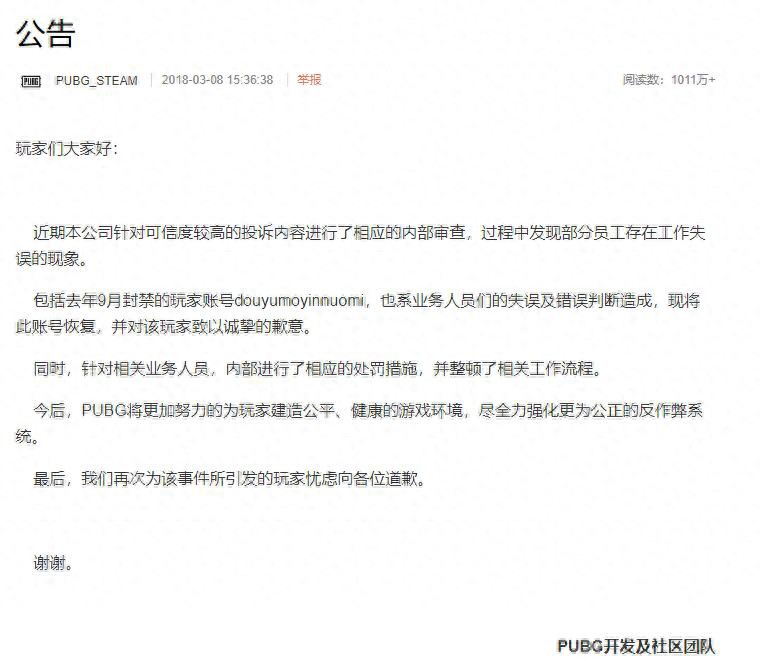今年3月8日,《绝地求生》官方发出公告表示,当时的“糯米开挂”事件中糯米使用的douyumoyinnuomi账号并没有开挂系官方误封,