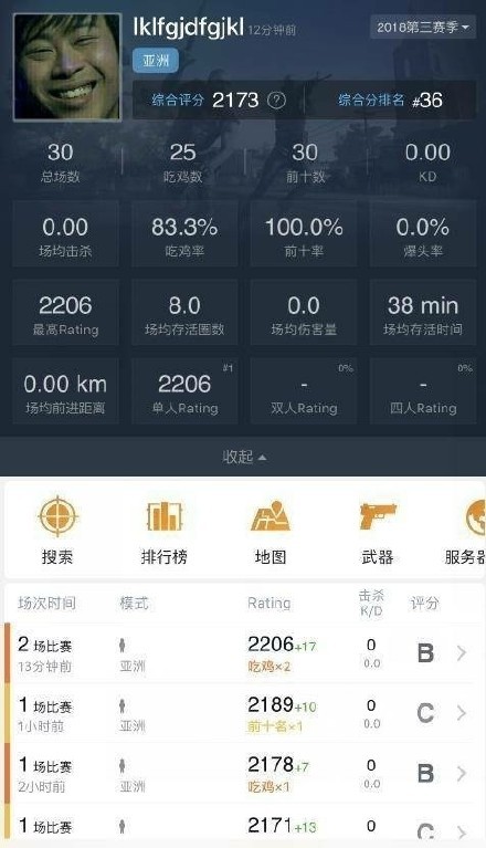 仔细看该玩家的数据,总共30场比赛,前十率100%,吃鸡率83.3%,KDA为0,伤害和行进距离都是0,也就是说,这名玩家只是打开《绝地求生》,开启外挂,然后就疯狂吃鸡了。