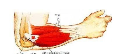 图中这个红色的点,还有其周边的区域,我们称之为肱骨外上髁。那么这个位置的所有肌肉是使我们能够伸腕的,叫伸肌总腱的止点,那么长时间做刺激这个位置肌肉的动作,比方说长时间的挥拍,长时间的用手机打字。就会诱发这个位置肌腱和骨骼之间的无菌性炎症,从而导致症状,我们就称之为肱骨外上髁炎,也就是所谓的网球肘。