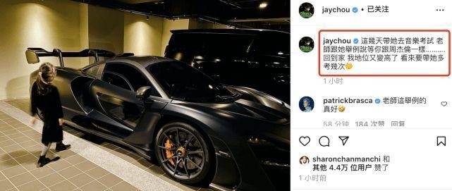 周杰伦附上女儿和自己的全球限量版跑车的合影。