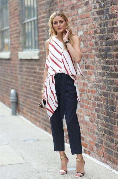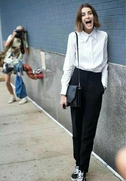 腰上有肉肉的女生,或是臀部比较大可以尝试这种搭配,上衣前短后长,下身烟管裤,既能收腰显瘦,又能收敛身材缺点,还很时髦,一双高跟鞋更是衬托的女人味十足。