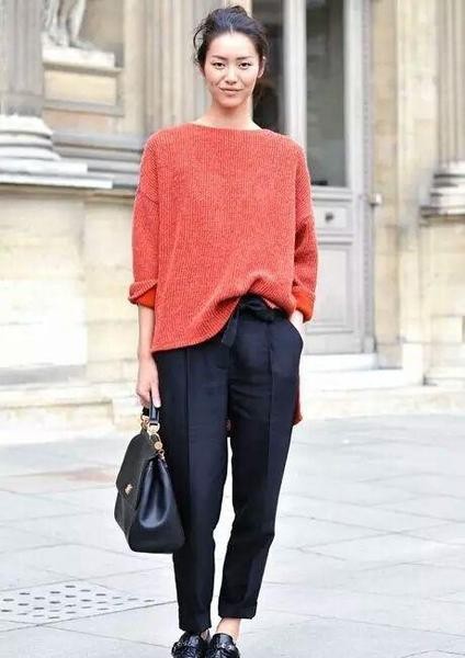 如果你大腿比较粗,那么带点哈伦风格的烟管裤会让你显得又瘦腿又长,前提是裤子的长度一定要把握好,上身红色毛线衣,半边扎进裤子里,黑红搭配很经典,又时尚。