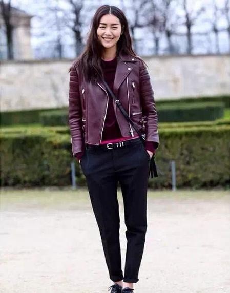 看刘雯这身搭配,酒红色的毛线搭配同色皮衣,下身配的黑色九分烟管裤,一双黑皮鞋,整个look非常帅气十足。