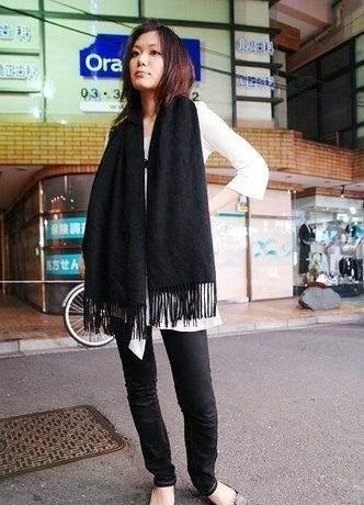 白色的连衣裙即使要搭配黑色烟管裤,如果裤子太长,可以卷到脚踝以上刚刚好的九分长度,这样才能显腿长,黑色的围巾让整个look显得沉闷非常,如果觉得进空调房太冷,围巾可以绕脖子卷一下搭配才好看。