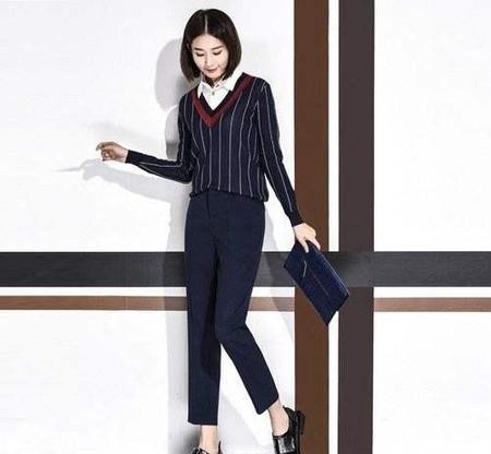 九分烟管裤搭配出校园学院风格,又有点职场ol范的look就数这种配搭方法了,百搭单品白衬衫配v领条纹针织衫,透出种轻熟女范。