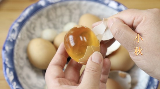 腌好后取出来,把鸡蛋表面的皮蛋泥全部清洗干净,敲开一个看一下,看看我腌的变蛋怎么样,蛋白和蛋黄都已经成型了,蛋清是晶莹剔透的琥珀色,蛋黄是糖心的,看着很漂亮。