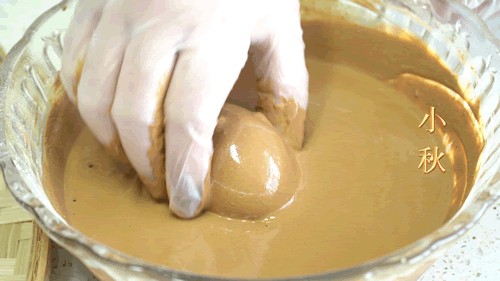 鸡蛋表面的水份也控干了,直接放到皮蛋泥里滚均匀,给鸡蛋裹上一层皮蛋泥,可以裹得稍微厚一点,不要漏出蛋壳部分,裹好后放到可以密封的容器里,或者是黑色的方便袋里都行,再把剩下的鸡蛋全部都裹上皮蛋泥,鹌鹑蛋也同样裹上皮蛋泥,放到坛子里。