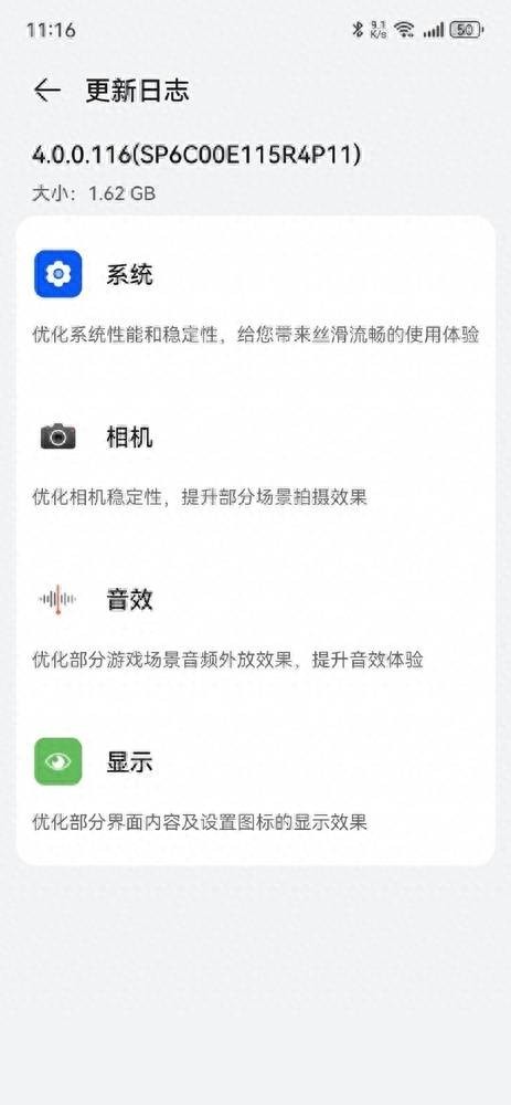 从该博主公布的截图可知,此次推出的新系统版本号为4.0.0.116。而相关更新介绍显示,此次更新主要包含四个方面。首先在系统方面,更新优化系统性能和稳定性,给您带来丝滑流畅的使用体验。在相机方面,新系统优化相机稳定性,提升部分场景拍摄效果。在音效方面,新系统优化部分游戏场景音频外放效果,提升音效体验。最后在显示方面,其优化部分界面内容及设置图标的显示效果。