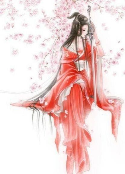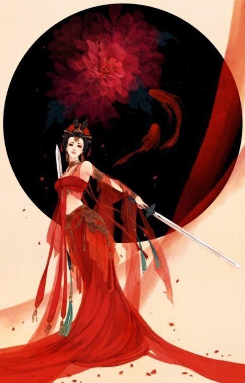 红衣女子双手拿剑,显得身姿绰约。(古风红衣女子手机壁纸,你红衣妩媚,却挡不住眼中的忧伤)
