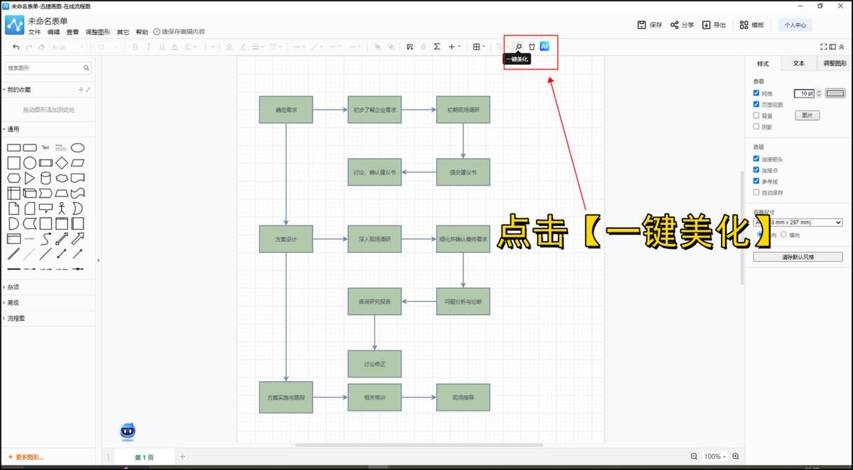 5、最后,对流程图进行美化处理,比如说调整布局、添加背景等等。还可以利用这个工具里面的一键美化功能进行操作。