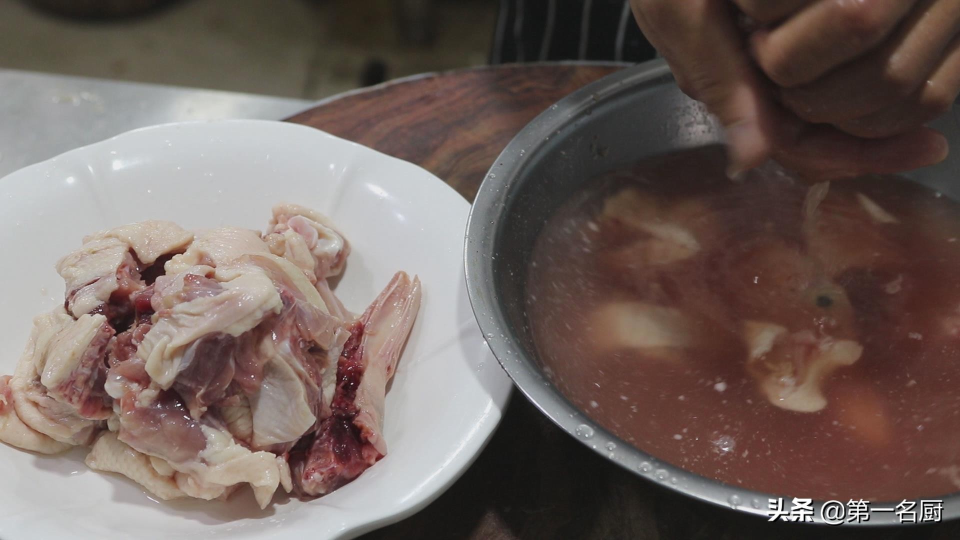 盆里加入清水,用手抓洗几遍,洗净里面的血水,挤去水分以后,放入盘中。