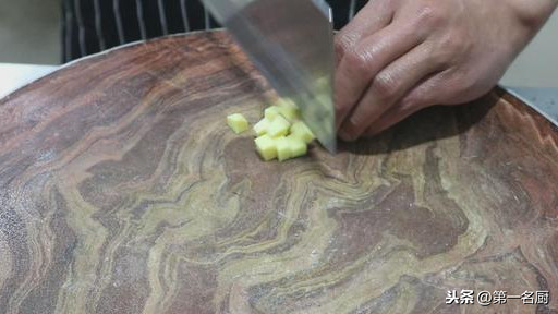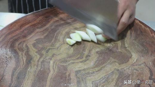 大葱白一段,切成马蹄片,放入盆中,生姜一小块切成姜片,和大葱放在一起。