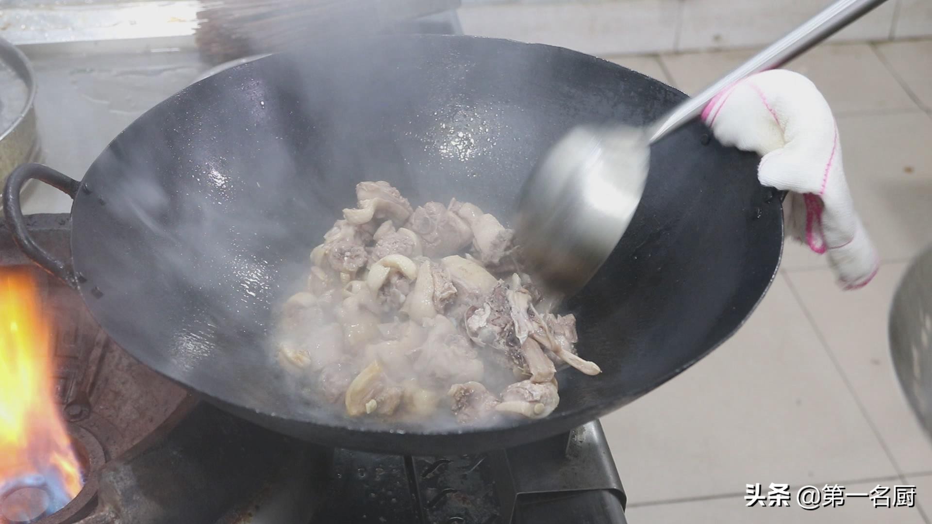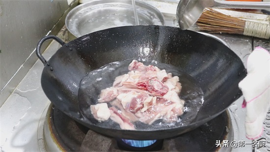 锅内烧水,凉水下入鸭肉,加入料酒10克去腥,用勺子翻动几下,使鸭肉受热均匀。