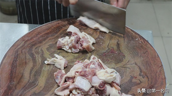 准备洗净的鸭子一只,先斩掉鸭头,再剁成大小均等的小块,放入盆中备用。