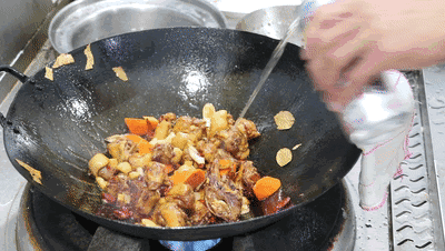 把糖汁从白色炒至红褐色时撤火,倒入鸭肉,改小火快速翻炒,把鸭肉裹匀糖色。
