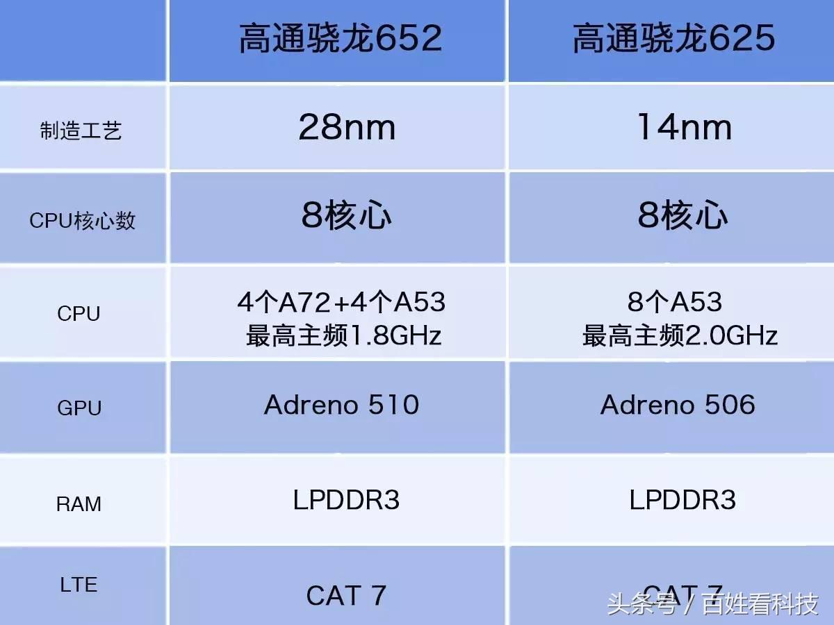 由于发布时间的前后差异,在制造工艺上,晚发布的骁龙625采用的是更加先进的14nm工艺,而骁龙652采用的是28nm工艺,因此理论上高通骁龙625应该有着更好的功耗和发热控制。