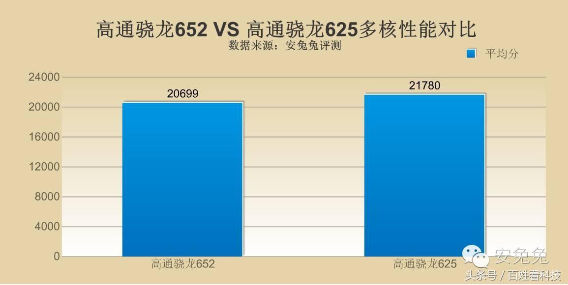 这两款芯片都是8核心设计,不过骁龙652的大核采用了A72架构,但A53架构的骁龙625的主频又比骁龙652略高一些。所以理论上整体性能两者不会差距太大。下面是两款处理器的跑分图:(忽略机型差异)
