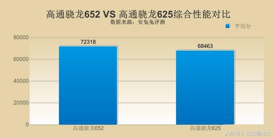综合性能方面,骁龙652平均跑分72318分,骁龙625的平均跑分68463分。分析:骁龙652的性能要比骁龙625略强,是因为其内部配备的4个A72核心起到了作用,作为ARM新一代核心,A72架构设计更加先进。所以别看骁龙625的8个A53大核最高主频都比骁龙652高,但是整体性能还是骁龙652要略强一点。