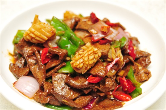 4、最后加上青红椒一块翻炒均匀之后,就可以出锅了。