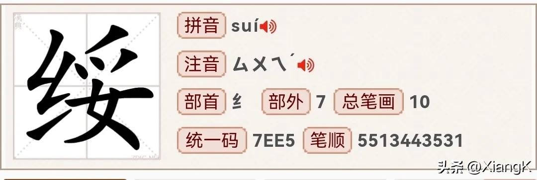 读音【suí】、同音字:随、部首为纟、总笔画10、左右结构。