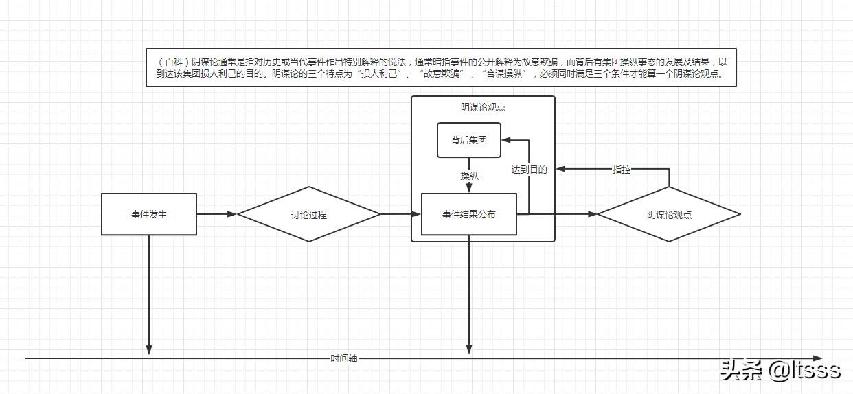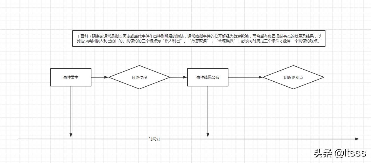 那么我们再回到阴谋论的解释中来:“阴谋论通常是指对历史或当代事件作出特别解释的说法,通常暗指事件的公开解释为故意欺骗”。这里提到阴谋论是暗指公开解释为故意欺骗,也就是说,从时间轴上来看,阴谋论的观点是在“事件结果公布之后”