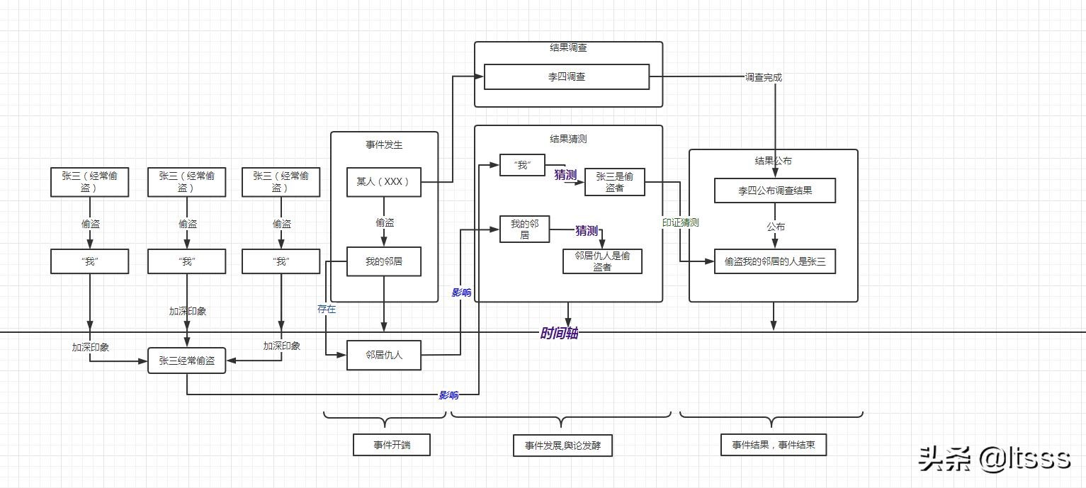 张三经常偷盗,同时“我“也经常被张三偷。有一天,我的邻居被偷了。事件调查交给了一位自称”公平公正“的李四来调查,预计调查时间需要很久。那么,在调查结果公布之前,”我“因为经常被张三偷,所以我有了应激反应,本能地认为”偷盗之事皆为张三所为“,所以做此猜测。但是,我的邻居不这么认为,他说他有一个仇人,他猜测”偷盗他的人是他的仇人“。那么等到调查结果公布,自称”公平公正“的李四公布调查结果:偷盗我的邻居的人是张三。这个结果刚刚好对上“我”的猜测。应该注意的是公布的结果未必是客观事实真相。公布结果之后,机智王五认为事情存在蹊跷,他提出新的观点,他认为:“我的邻居的仇人为了报复我的邻居,指使张三偷盗我的邻居,同时也买通了调查人员李四,让李四公布邻居仇人想让公布的结果“。