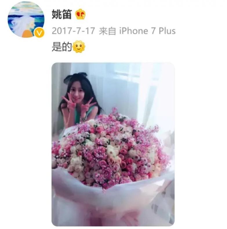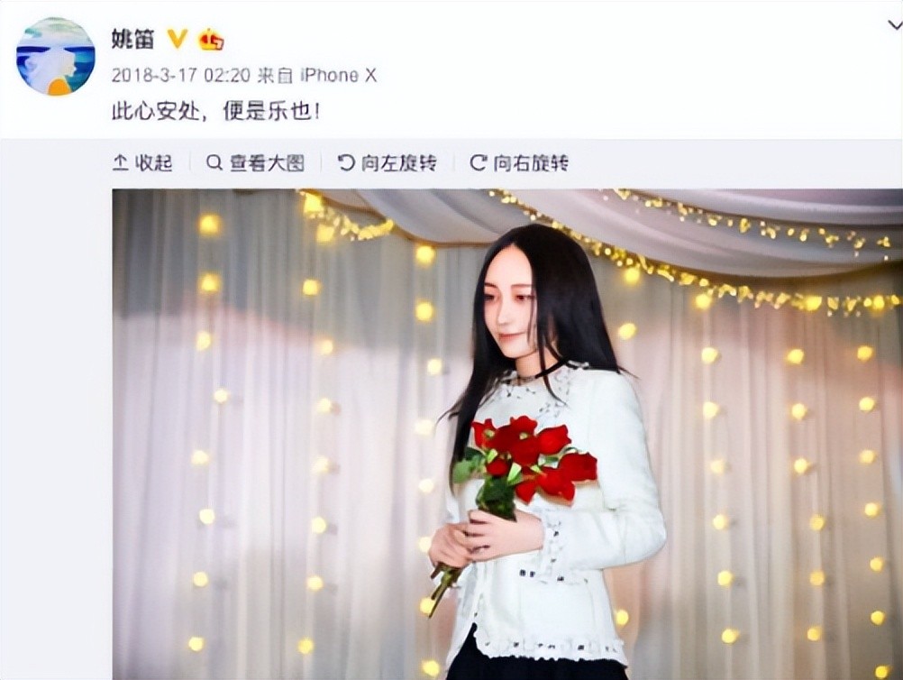 2018年,姚笛在社交平台上突然晒了一张自己拿着玫瑰的照片。