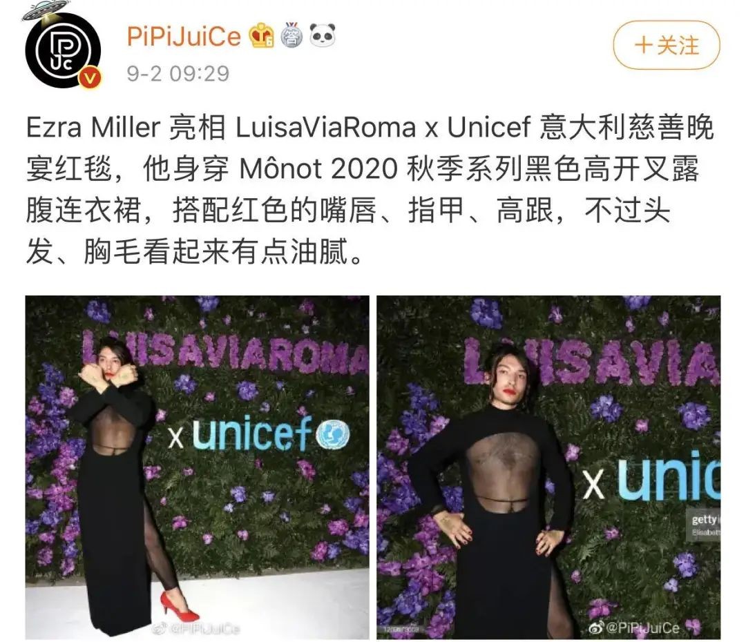 最近,站在意大利慈善晚宴红毯上的闪电侠埃兹拉·米勒引起壹读君的注意,一米八大高个、身穿高开叉露腹连衣裙、脚蹬高跟鞋、抹着大红嘴唇、一巴掌宽护心毛格外亮眼。