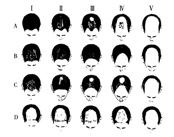 Ⅰ到Ⅴ是从初期到晚期不同阶段不同人种脱发“形势”;A:北欧人的脱发类型,中间一束发持续存在;B:犹太人的脱发类型,前额发际线进行性变秃而无头顶脱发;C:拉丁人和地中海人的脱发类型;D:女性雄激素性脱发。