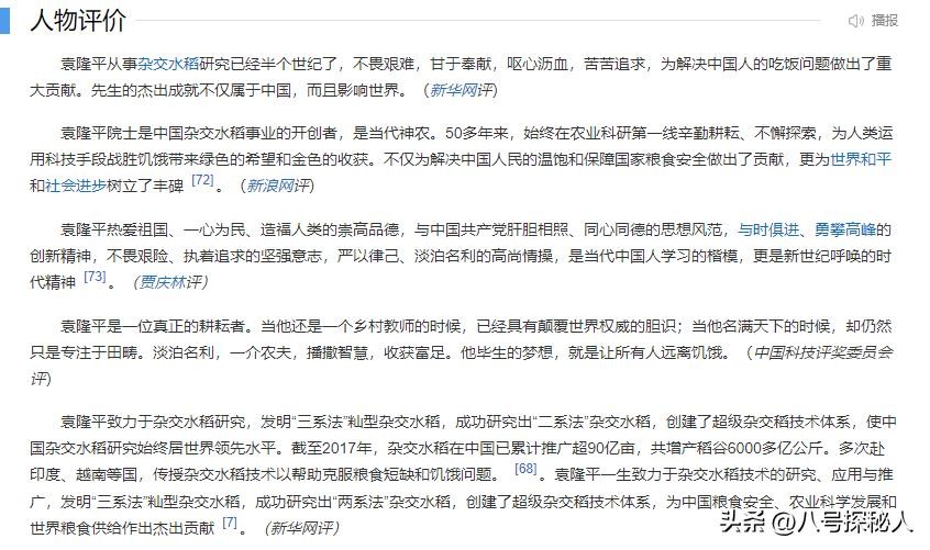 【信息来源:百度百科-袁隆平-人物评价、中国经济网2007年5月28日发布