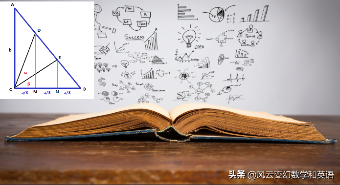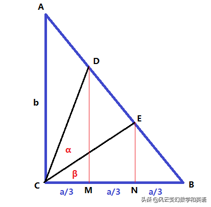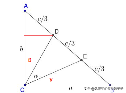 三角形ABC是直角三角形,D、E两点将斜边三等分点,∠DCE=α,