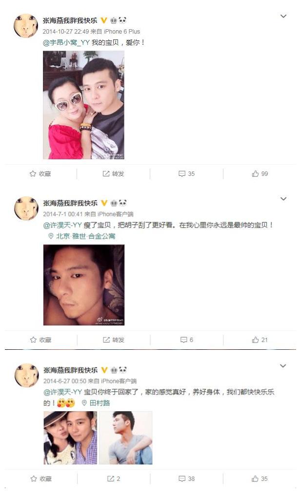 而且在张海燕和男模的微博中,依然可以找到两人秀恩爱的照片,就是在2014年,张海燕频繁的发博秀恩爱,文案大多数都是记录一些事情,和谁做了什么,昵称比较肉麻,都是宝贝什么的,并配一张和某男子的甜蜜合照。