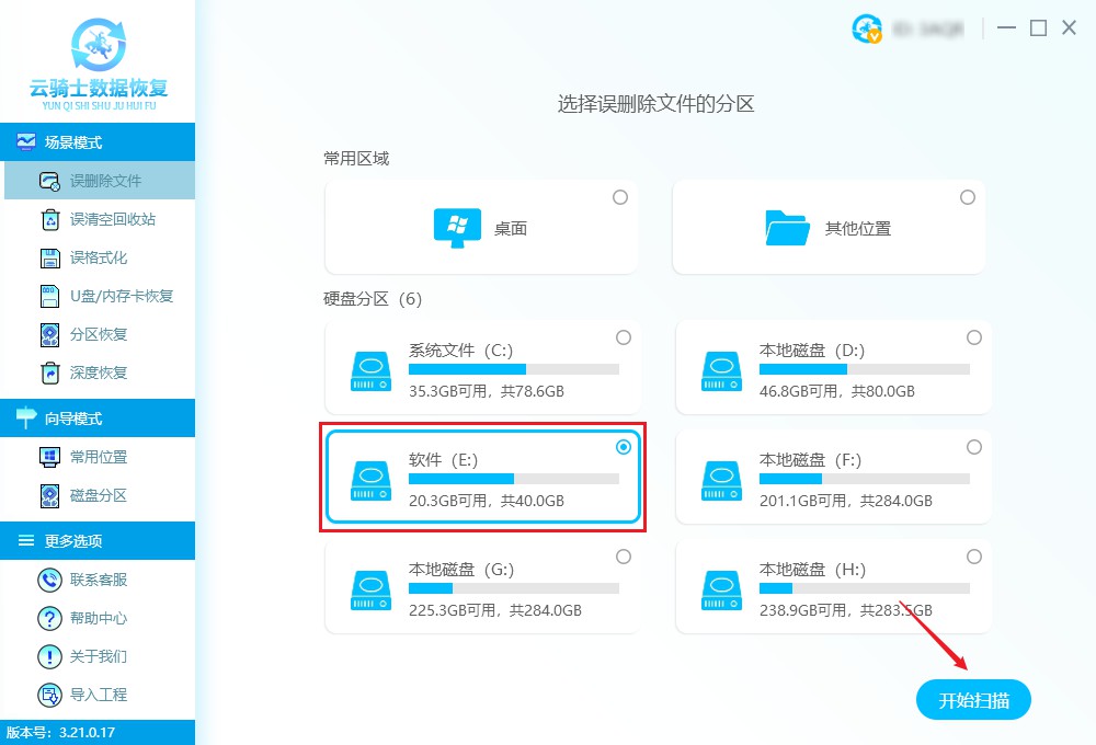 步骤1:打开常备在电脑中的“云骑士数据恢复软件”,根据需要选择恢复功能,对于恢复误删除的软件,可选用场景模式下的“误删除文件”。