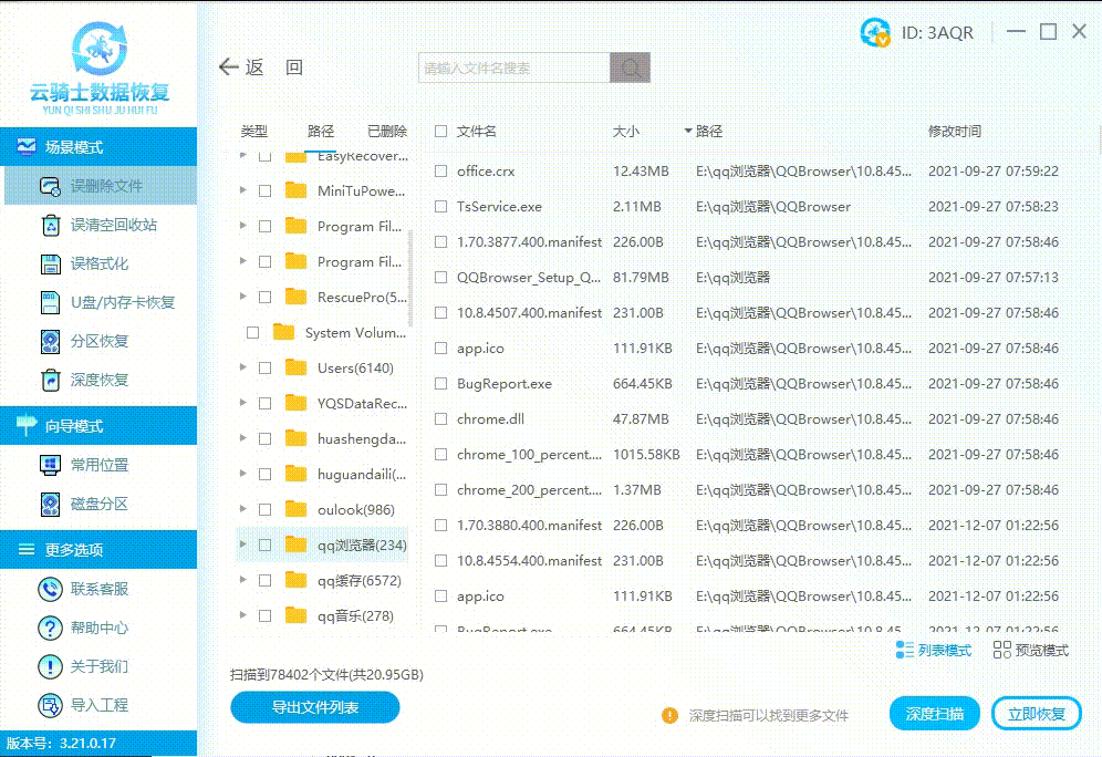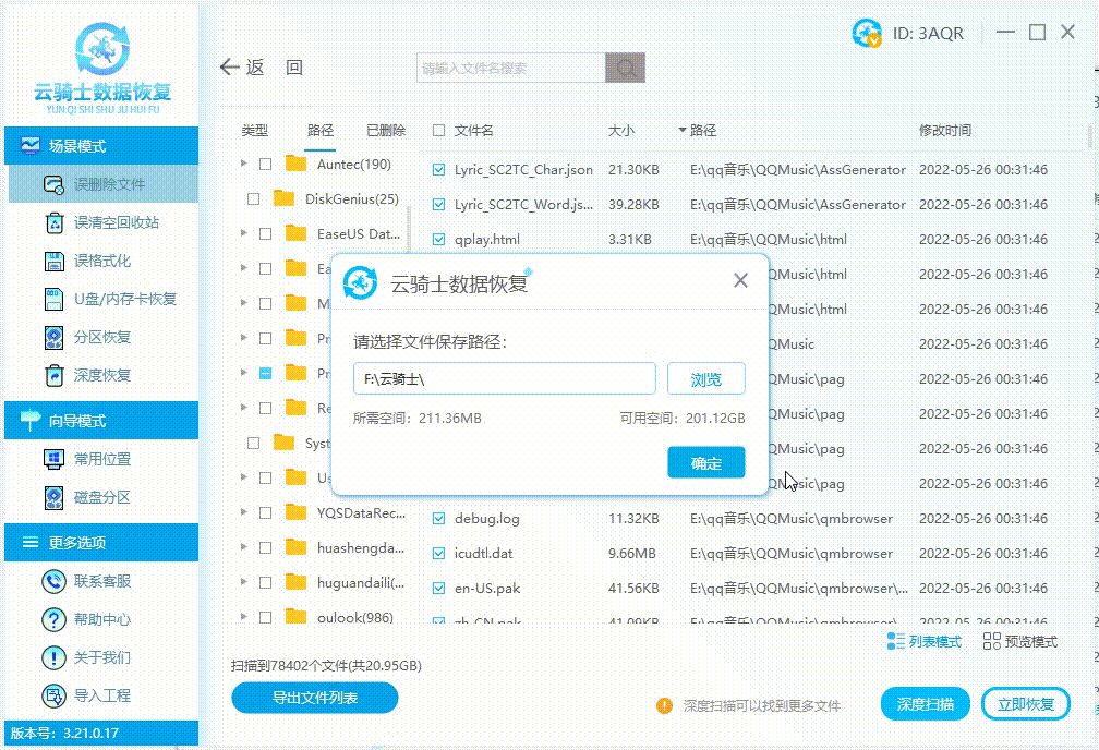 如果无法重新下载安装软件,删除的文件也不在回收站里并且没有任何备份,那么可以按照方法四的步骤试试。云骑士数据恢复软件能解决因误删除、误格式化、误清空回收站、分区打不开提示格式化等数据丢失问题,并且支持恢复文件类型和格式众多,比如常见的压缩文件(zip、exe、rar等)、视频文件(mp4、avi、mov等)、音频文件(mp3、wav、aif等),支持恢复不同类型设备,如台式/笔记本电脑、硬盘、U盘、内存卡等,在特有的筛选方式下快速找到文件并恢复。