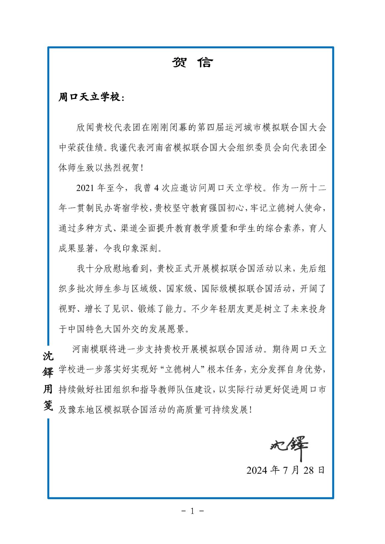 7月28日,开封市青联委员、河南省模拟联合国大会组织委员会执行主任、首批“周口市高层次人才”入选者沈铎代表河南模联致信周口天立学校,祝贺该校代表团在刚刚闭幕的第四届运河城市模拟联合国大会中荣获外出参会以来历史最好成绩。
